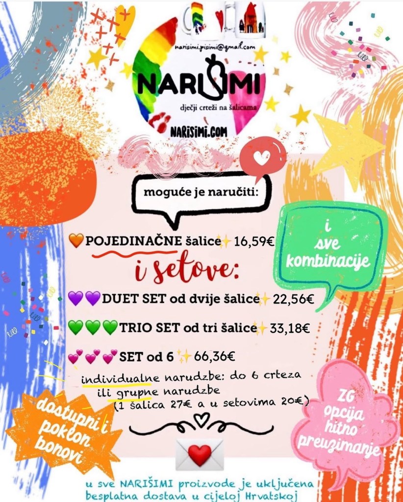 - u slučaju da želite naručiti više od jedne NARIŠIMI šalice na istu adresu – najpovoljniji je neki od promo setova a tu su i grupne narudžbe za grupne poklone te uvijek odmah dostupni poklon bonovi ako želite darovati NARIŠIMI šalicu nekome i(li) nemate spreman crtež kod sebe 🙂