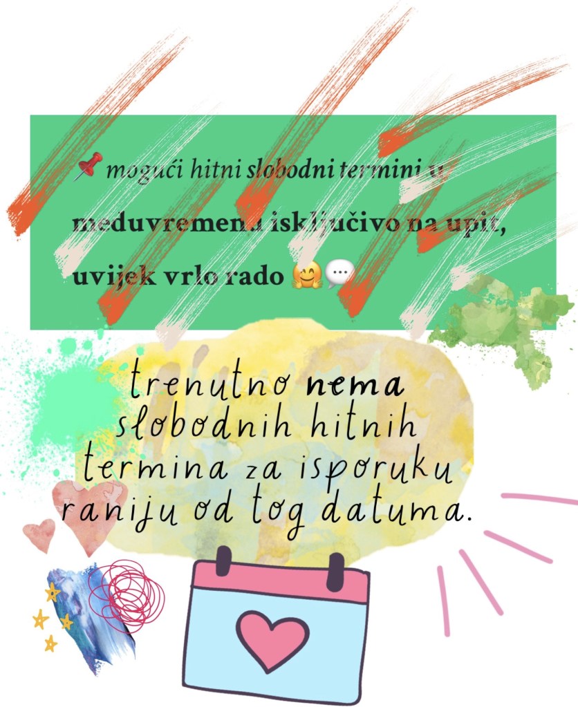 idealno je da predvidimo desetak radnih dana od narudžbe 👈 za izradu, a za HITNE mi se slobodno direktno javite porukom/mailom – kad god je ikako moguće rado nađem način za izradu u zadnji tren❣️