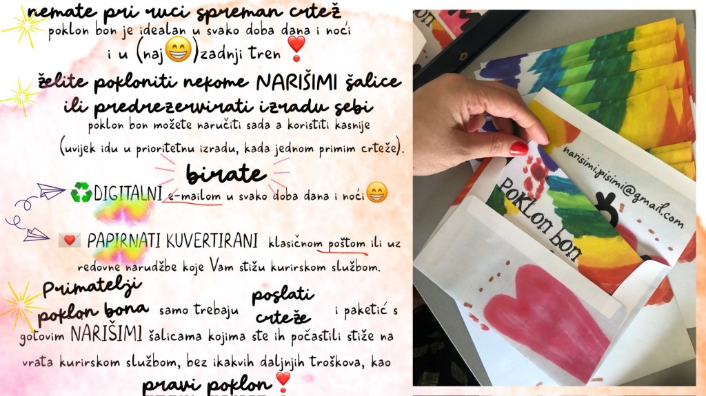 Digitalni poklon bon šaljem e-mailom, Vama ili na adresu koju želite. Obično dodam i poruku po želji ako šaljem direktno primateljima poklona. Crteže za šalice primam naknadno, kada već budu spremni i odabrani i potom šaljem izrađene šalice, koje su već plaćene u startu narudžbom poklon bona.
