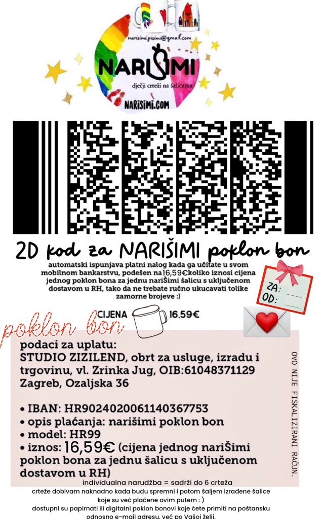 Svaki poklon bon NARIŠIMI jedinstvenim kodom je vezan uz Vašu uplatu i može se iskoristiti po želji, prateći upute koje će pisati na bonu.