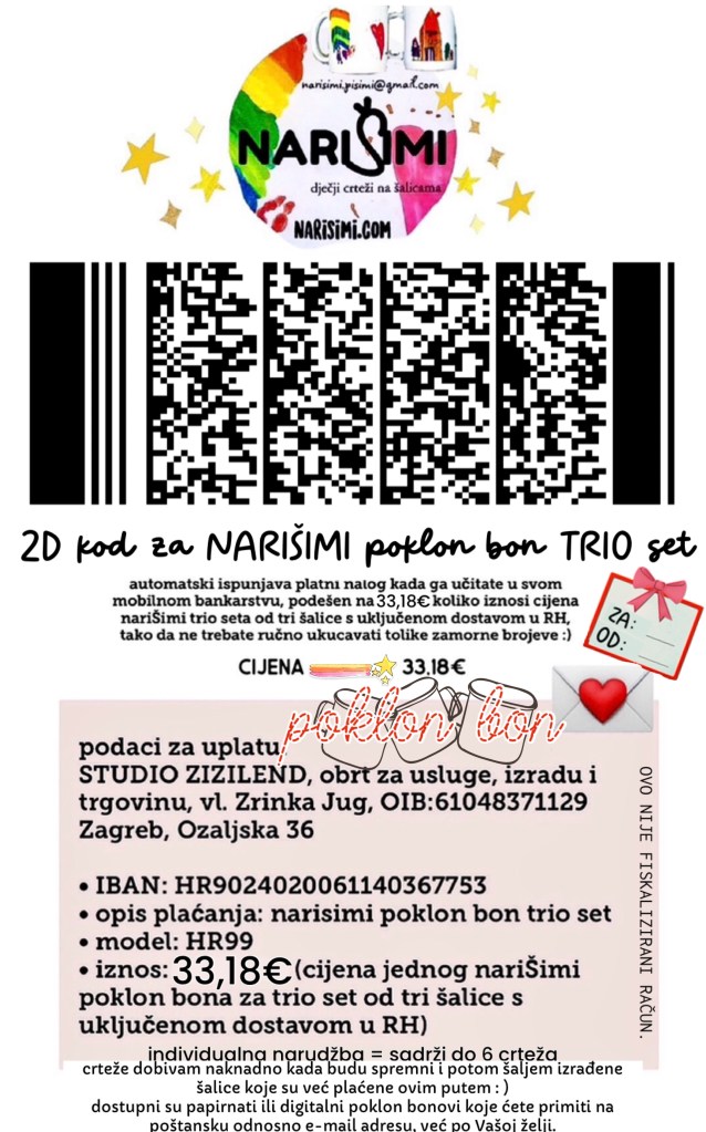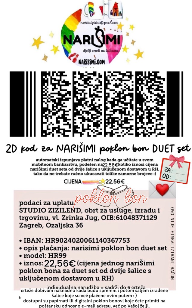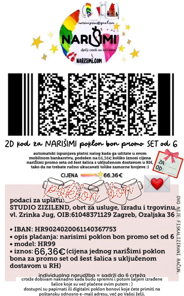 Moguće je naručiti više šalica jednim poklon bonom – sve će biti vezane uz isti jedinstveni kod bona. U tom slučaju najpovoljnija je opcija poklon bonom darovati neki od dostupnih individualnih promo setova narišimi šalica izlistanih u nastavku i jednostavno – javite se s potvrdom izvršene uplate (IBAN: HR9024020061140367753; opis plaćanja: narisimi poklon bon; model: HR99) na e-mail narisimi.pisimi@gmail.com